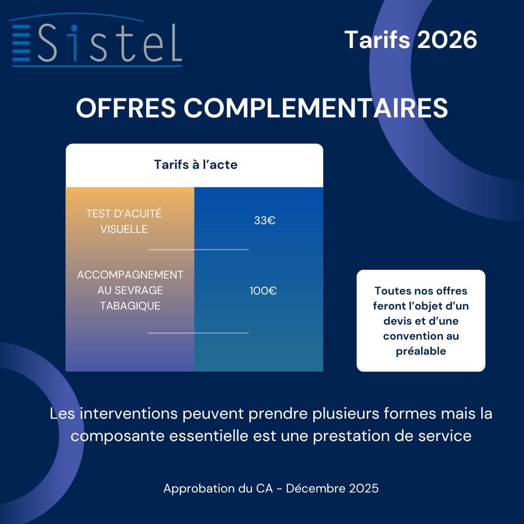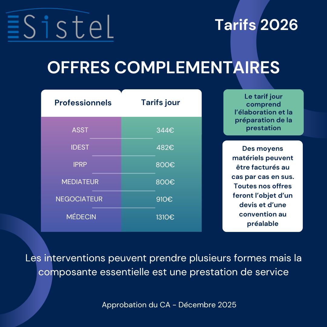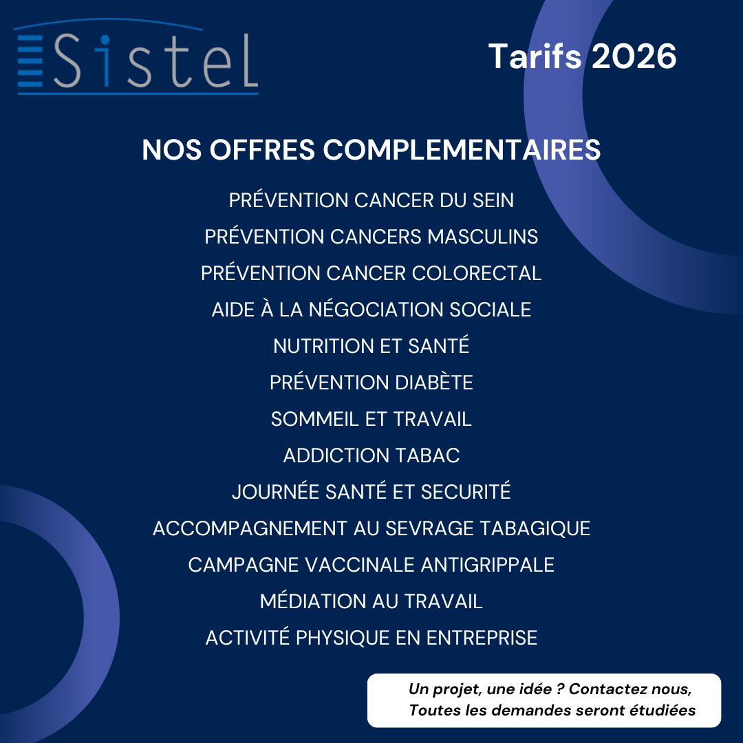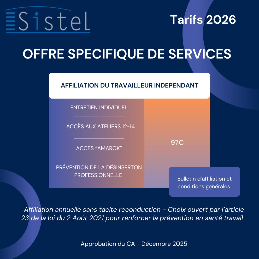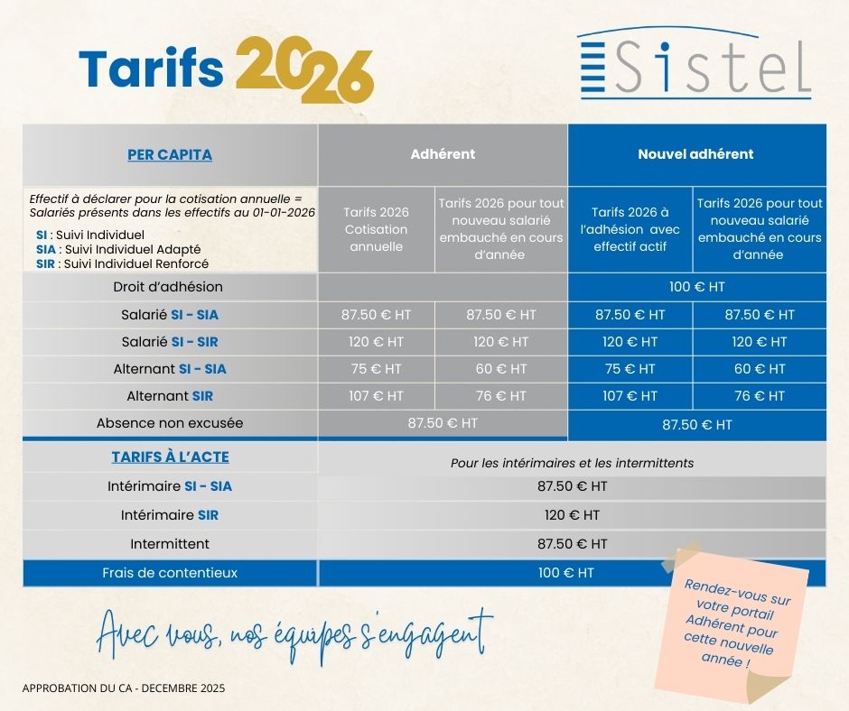 L’arrêté daté du 25 septembre 2025 encadre les tarifs 2026 pratiqués par les Services de Prévention et de Santé au Travail Interentreprises en fixant un montant de cotisations compris entre 92,80 € HT et 139,20 € HT. Le Conseil d’Administration de Sistel, en sa séance du 9 décembre 2025, a approuvé la grille tarifaire ci-dessous.